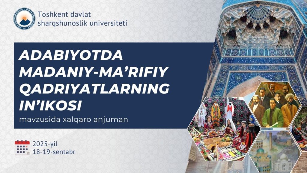 Toshkent davlat sharqshunoslik universiteti “Janubiy Osiyo tillari va adabiyoti” oliy maktabi tomonidan “Ilm-fanni 2030-yilgacha rivojlantirish konsepsiyasini tasdiqlash to‘g‘risida(O‘zbekiston Respublika Prezidentining 2020-yil 29-oktyabrdagi PF-6097-son Farmoni)ga asosan 2025-yilning 18-19-sentabirida Hindistonning Javaharlal Nehru universiteti hamkorligida “Adabiyotda madaniy-ma’rifiy qadriyatlarning in’ikosi” mavzusida xalqaro ilmiy-amaliy konferensiya o‘tkaziladi.