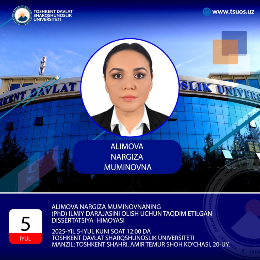 Alimova Nargiza Muminovnaning 23.00.04 – Xalqaro munosabatlar, jahon va mintaqa taraqqiyotining siyosiy muammolari ixtisosligi bo‘yicha “Yaqin Sharqdagi yangi geosiyosiy vaziyat sharoitida Islom hamkorlik tashkilotining rivojlanish istiqbollari” mavzusida siyosiy fanlar bo‘yicha falsafa doktori (PhD) ilmiy darajasini olish uchun taqdim etilgan dissertatsiyasi himoyasi