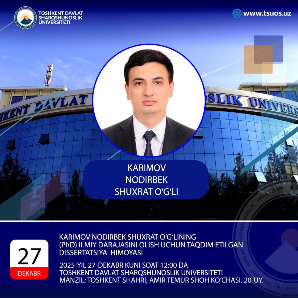Karimov Nodirbek Shuxrat o‘g‘lining 10.00.05 – Osiyo va Afrika xalqlari tili va adabiyoti ixtisosligi bo‘yicha yozgan “Li Munyol qissa va hikoyalari badiiyati” mavzuidagi filologiya fanlari bo‘yicha falsafa doktori (PhD) ilmiy darajasini olish uchun taqdim etilgan dissertatsiya himoyasi: 2025-yil, 27-dekabr, soat 12:00.