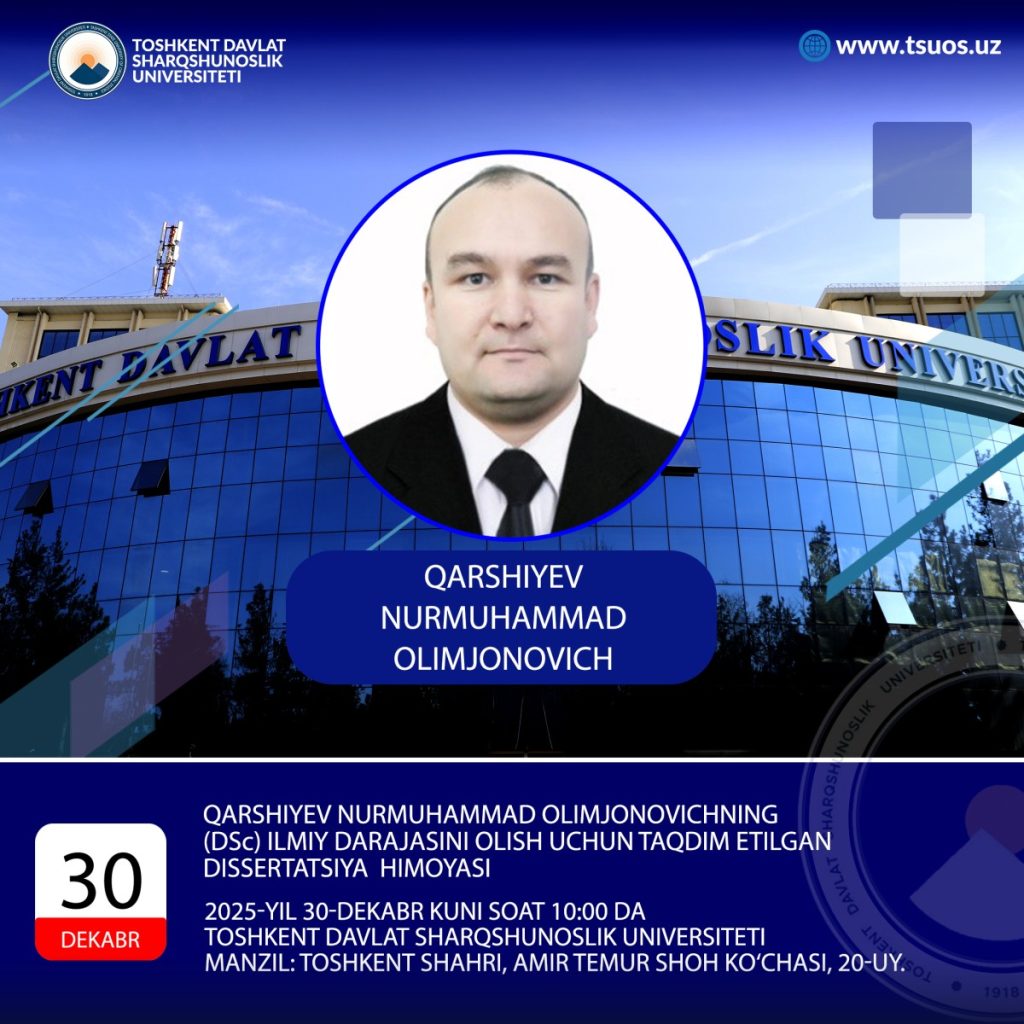 Qarshiyev Nurmuhammad Olimjonovichning  23.00.03 – “Siyosiy madaniyat va mafkura”  ixtisosligi bo‘yicha “Markaziy Osiyo davlatlarida siyosiy partiyalar mafkuralari shakllanishi va rivojlanishining umumiyligi hamda o‘ziga xos xususiyatlari” mavzusida siyosiy fanlar doktori (DSc) ilmiy darajasini olish uchun taqdim etilgan dissertatsiya himoyasi:2025-yil 30-dekabr kuni soat 10:00