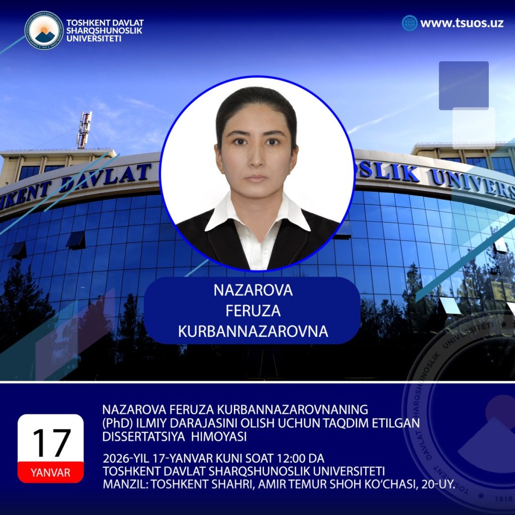 Nazarova Feruza Kurbannazarovnaning 23.00.04 – Xalqaro munosabatlar, jahon va mintaqa taraqqiyotining siyosiy muammolari” ixtisosligi bo‘yicha “Культурная дипломатия в развитии межгосударственного сотрудничества в рамках ШОС” mavzusidagi siyosiy fanlar bo‘yicha falsafa doktori (PhD) ilmiy darajasini olish uchun yozilgan dissertatsiya ishi himoyasi Toshkent davlat sharqshunoslik universiteti huzuridagi ilmiy darajalar beruvchi DSc.03/29.12.2022.Sc.21.02 raqamli Ilmiy kengashning  2026-yil 17-yanvar kuni soat 12:00 dagi majlisida bo‘lib o‘tadi.
