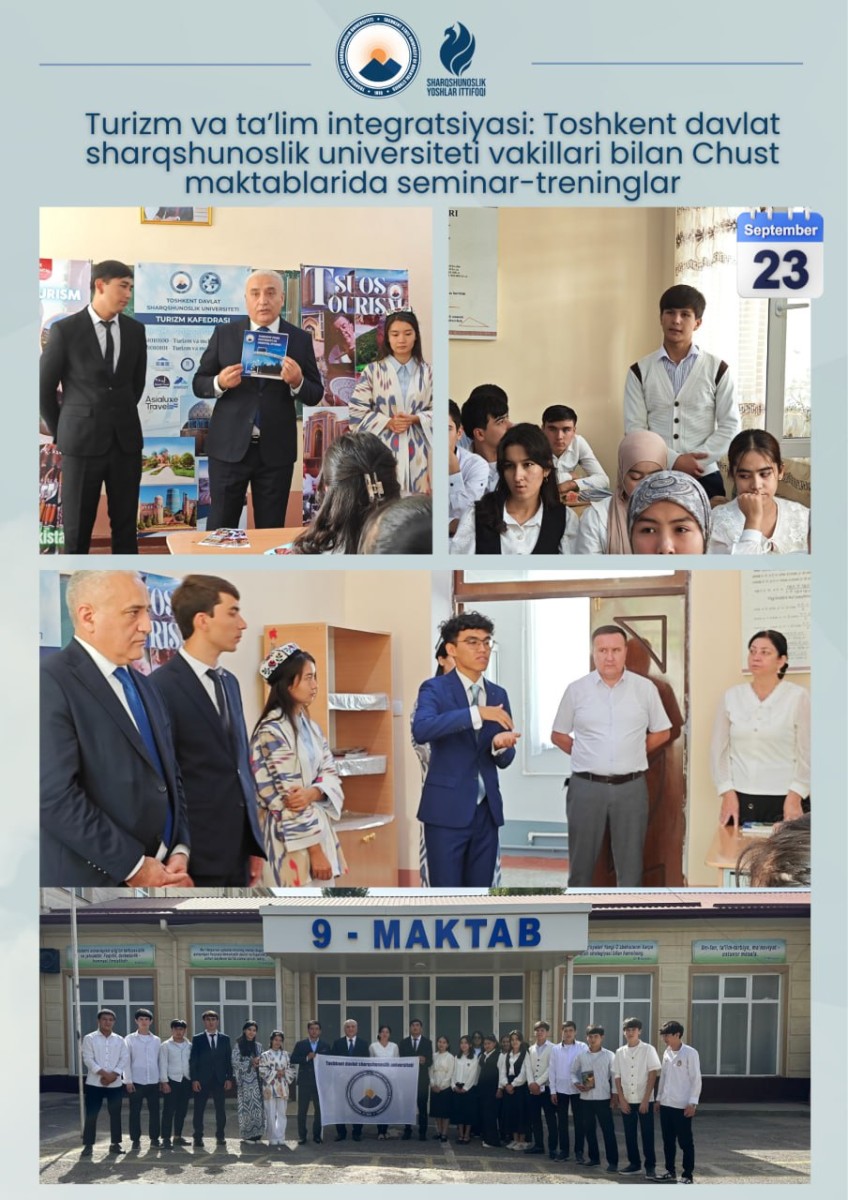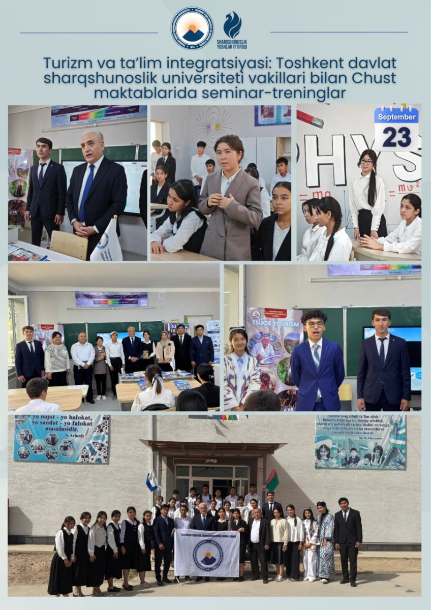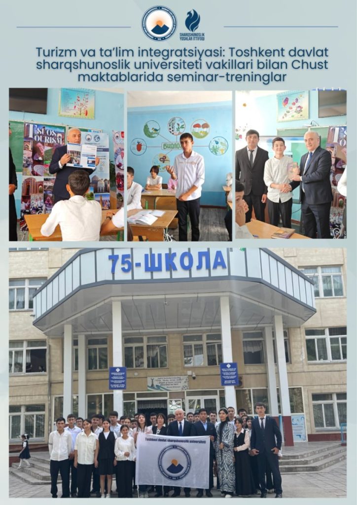 On the initiative of the Tourism Working Group of Tashkent State University of Oriental Studies, on September 23, 2025, open dialogues were organized in secondary schools No. 9, No. 13, and No. 75 of Chust District. The aim was to widely promote the tourism potential of the district and to familiarize the younger generation with national values, the region’s rich cultural heritage, and tourism opportunities.