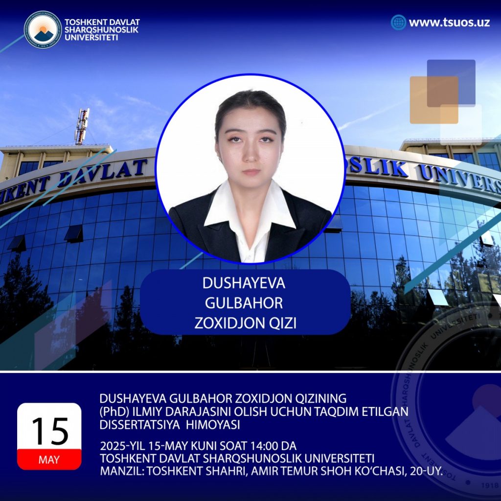 Dushaeva Gulbahor Zokhidjon kizi presented for obtaining the degree of Doctor of Science (PhD) on political sciences on the specialty 23.00.04 – Political problems of international relations, global and regional development on theme “The Republic of Korea and Central Asia: the experience of cooperation and the current situation”, defense will be held at the meeting of the Academic Council numbered DSc.03/29.12.2022.Ss.21.02 at the Tashkent State University of Oriental Studies at 14:00 on May 15, 2025.