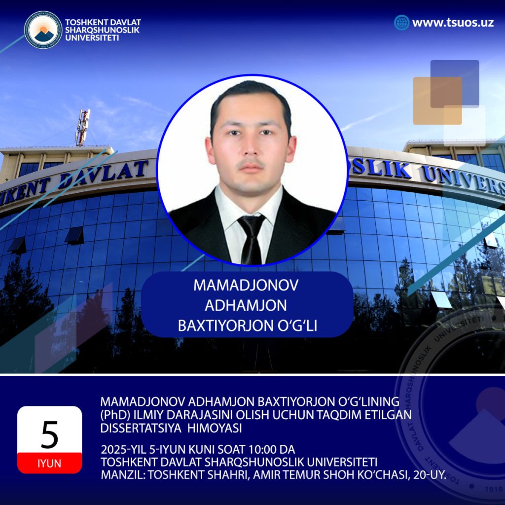 Defense of the thesis of Mamadjonov Adhamjon Bakhtiyorjon ugli on the topic “The factor of “soft power” in the foreign policy of Turkey in Central Asia” submitted for the degree of Doctor of Philosophy in political science (PhD) in the specialty 23.00.04 – Political problems of international relations, global and regional development will be held at a meeting of the Academic Council under the number DSc.03/29.12.2022.Ss.21.02 at Tashkent State University of Oriental Studies at 10:00 a.m. on June 5, 2025.