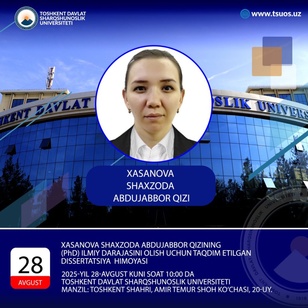 Xasanova Shaxzoda Abdujabbor qizi, the dissertation prepared by specialty 10.00.06 – Comparative literary criticism, contrastive linguistics and translation studies on the topic: “The representation of verb phraseological units in the uzbek translation of Mo Yan‘s novel “Republic of Wine”” to obtain the degree of Doctor of philosophy (PhD) on philological sciences. The defense will take place: 2025, August 28, at 10:00 am.