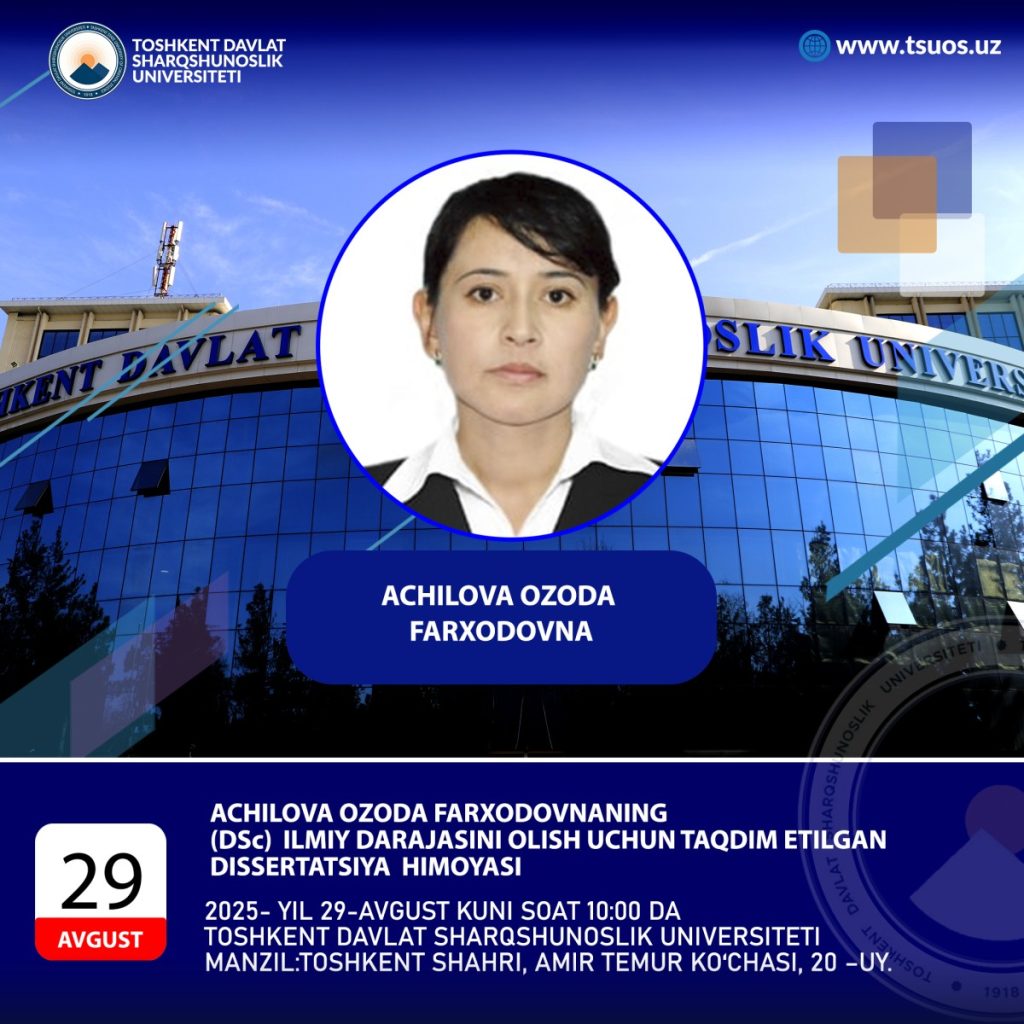 Achilova Ozoda Farkhodovna, the dissertation prepared by specialty 10.00.06 – Comparative literary criticism, contrastive linguistics and translation studies on the topic: “Pragma-discursive features of the Japanese and Uzbek imperative proverbs” to obtain the degree of Doctor of Philological Sciences (DSc). The defense will take place: August 29, 2025, 10:00.