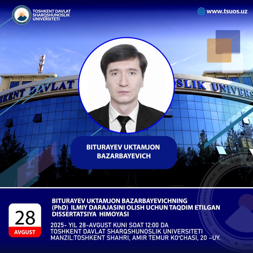 The defense of the dissertation prepared by Bituraev Uktamjon Bazarbaevich on the topic: “Development processes of interrelations between the Federal Republic of Germany and Central Asian states” submitted for the degree of Doctor of philosophy (PhD) on Political sciences, specialty 23.00.04 – “International Relations, Political Problems of World and Regional Development”,  Date of defense: August 28, 2025, at 12:00 pm.