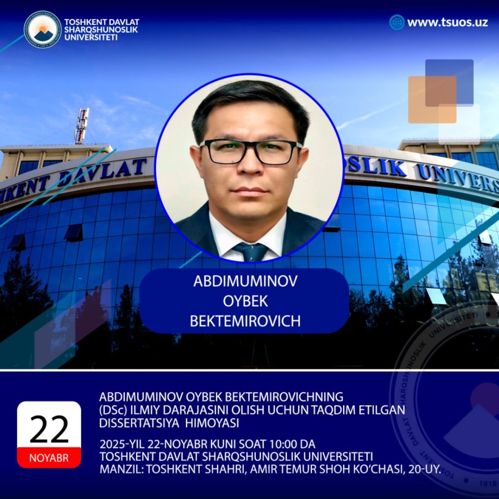 Abdimuminov Oybek Bektemirovich dissertation written for obtaining the degree of Doctor of Science (DSc) in historical sciences on the topic “History of relations between Central Asian countries and the United Nations” in the specialty of 07.00.05 – History of International Relations and Foreign Policy, defense will be held at the meeting of the Academic Council numbered DSc.03.31.01.2024.Tar.21.03 at the Tashkent State University of Oriental Studies at 10:00 on November 22, 2025.