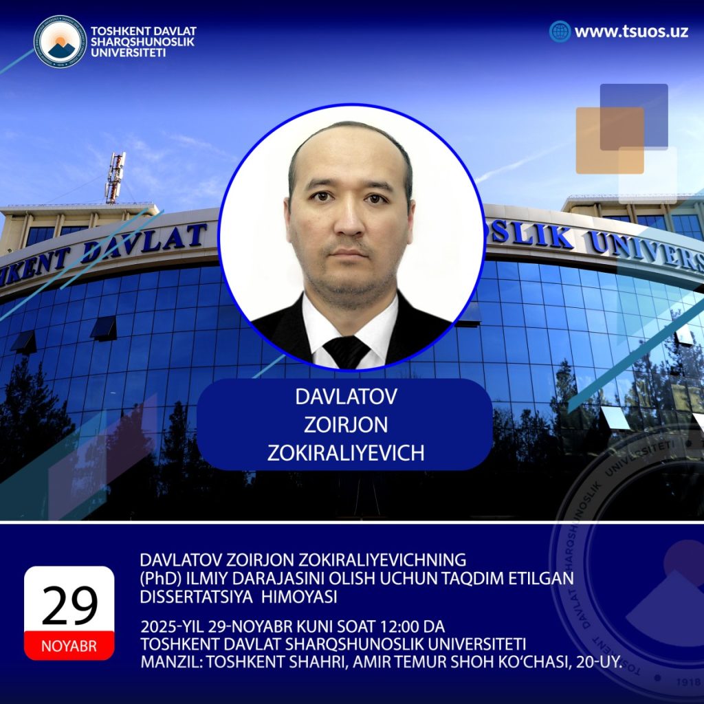 Zoirjon Zokiraliyevich Davlatov presents his dissertation for the degree of Doctor of Philosophy (PhD) in Philology in the specialty 10.00.06 – Comparative Literature, Comparative Linguistics, and Translation Studies on the topic: “Auxiliary Verbs in Turkish and their expression in Uzbek.” November 29, 2025, 12:00 p.m.