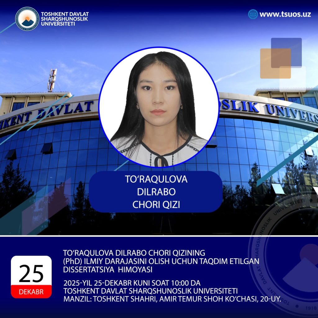Defense of the dissertation submitted by Dilrabo Chori qizi To‘raqulova for the degree of Doctor of Philosophy (PhD) in Philological Sciences, specializing in 10.00.06 – Comparative Literary Studies, Contrastive Linguistics, and Translation Studies, on the topic “Translation of Non-Equivalent Lexis in Uzbek Short Stories into Korean” The defense will take place on December 25, 2025, at 10:00.