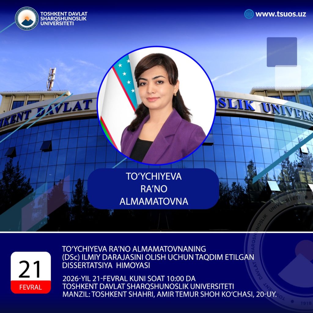 The defense of the dissertation submitted by Rano Tuychiyeva Almamatovna for the degree of Doctor of Political Sciences (DSc) in the specialty 23.00.04 – “Political Problems of International Relations and Global and Regional Development,” entitled “India’s Foreign Policy Strategy in the System of Contemporary International Relations,” will take place on February 21, 2026, at 10:00 a.m. at the meeting of the Academic Council DSc.03/2025.27.12.Ss.05.02 under the Tashkent State University of Oriental Studies.