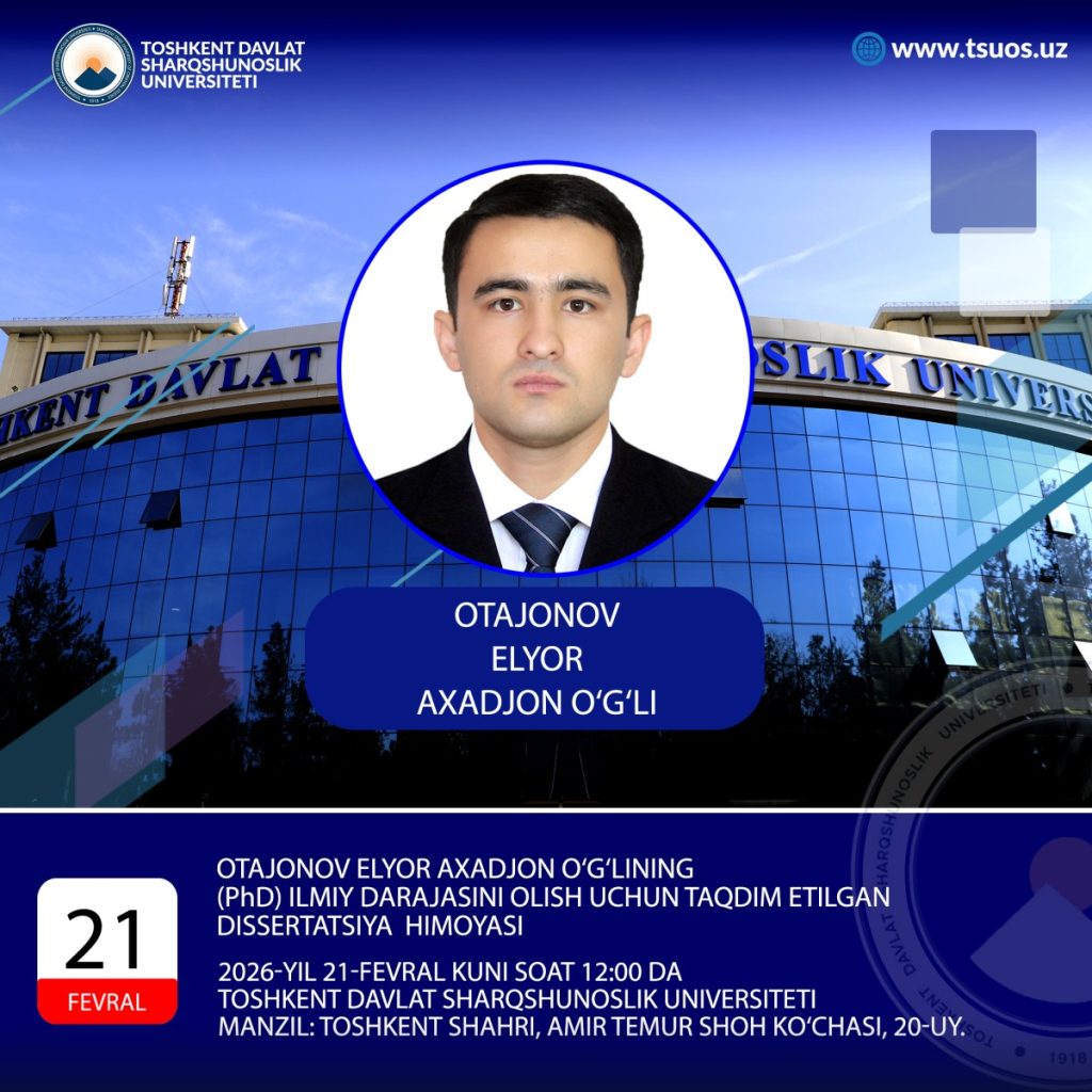 The defense of the dissertation work of Otajonov Elyor Akhadjon oglu for the degree of Doctor of Philosophy (PhD) in Political Sciences on the topic “Administrative reforms and their role in transforming society (analysis of national and Eastern countries’ experiences)” in the specialty 23.00.02 – “Political institutions, processes and technologies” on the topic “Administrative reforms and their role in transforming society (analysis of national and Eastern countries’ experiences)” will be held at the meeting of the Academic Council under the Tashkent State University of Oriental Studies, DSc.03/2025.27.12.Ss.05.02, which awards scientific degrees, on February 21, 2026 at 12:00