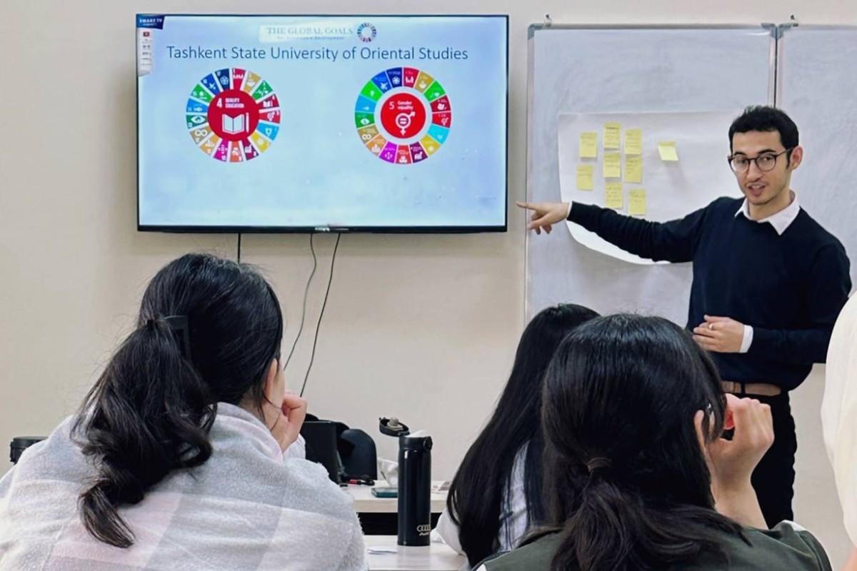 An open lecture on the topic of “SDG 4 – Quality Education” within the framework of the United Nations’ 17 Sustainable Development Goals (SDGs) was conducted by Akbar Ibragimov, English language instructor at the Department of Western Languages of Tashkent State University of Oriental Studies, together with first-year students of the Korean-English group of the Faculty of Korean Studies.
