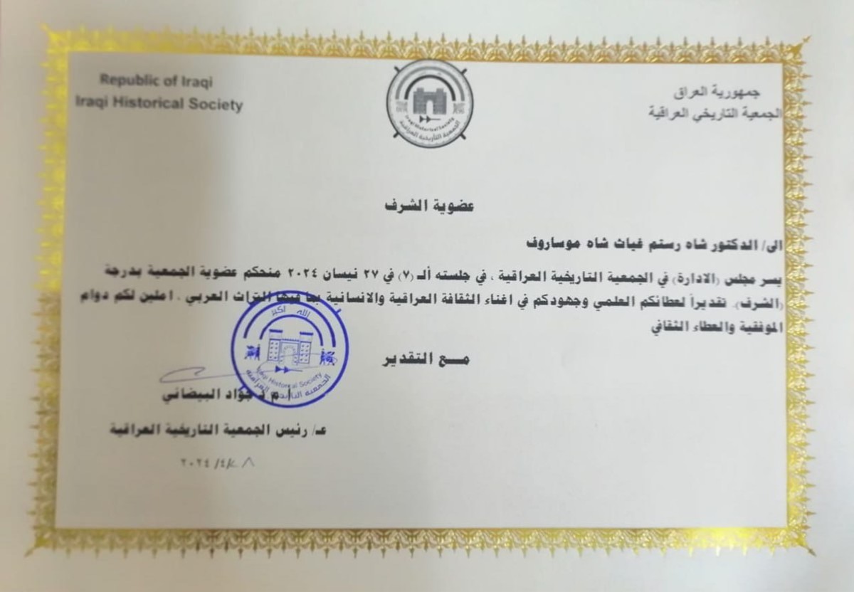 Shorustam Shomusarov, a professor at Tashkent State University of Oriental Studies (TSUOS), was admitted as an honorary member of the Iraqi Historical Society and awarded a certificate at the management board meeting held on April 27, 2024, in recognition of his achievements in scientific research, his contributions to the study of Iraqi culture and Arab heritage, and his active role in international cooperation.