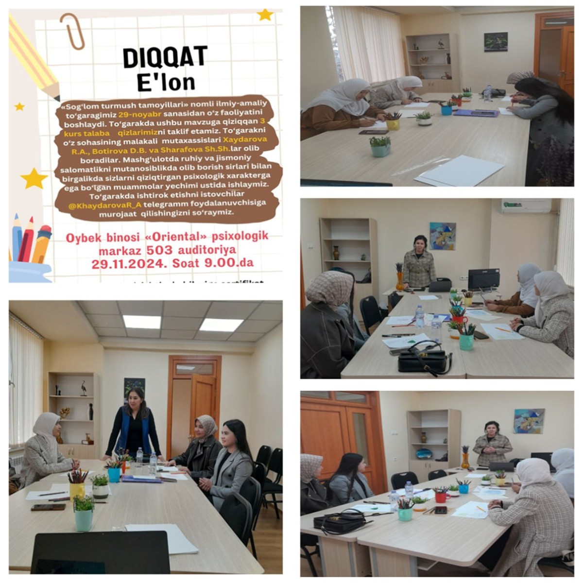 In November 2024, a roundtable discussion was held at TSUOS by senior lecturers of the Department of Pedagogy and Psychology — Senior Lecturer R. Khaydarova and PhD, Senior Lecturer D. Botirova — on the topics of “Principles of Health and Healthy Living” and “Fundamentals of Rational Nutrition” respectively.