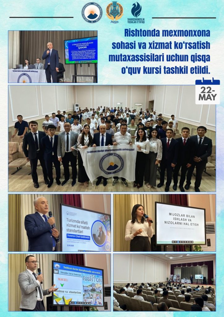 The Tourism Department of Tashkent State University of Oriental Studies, headed by Ch. Khusanov, organized a short-term training course titled “Service Standards and Customer Relations” for employees of the hospitality and service sectors in the Rishton district. The main goal of this course was to train qualified specialists who are client-oriented and meet the demands of modern service standards.
