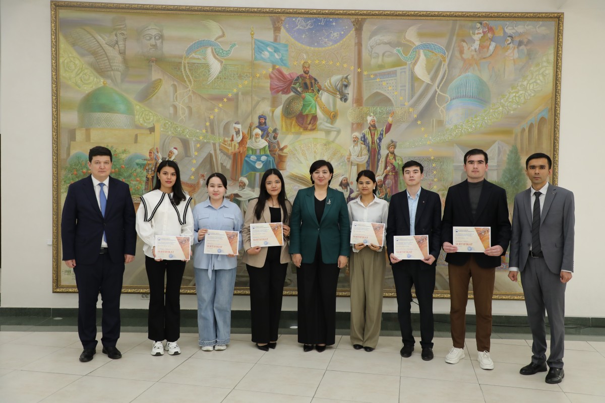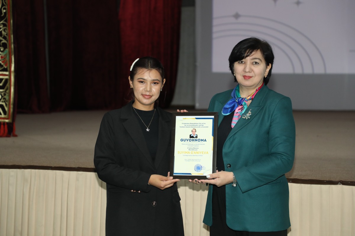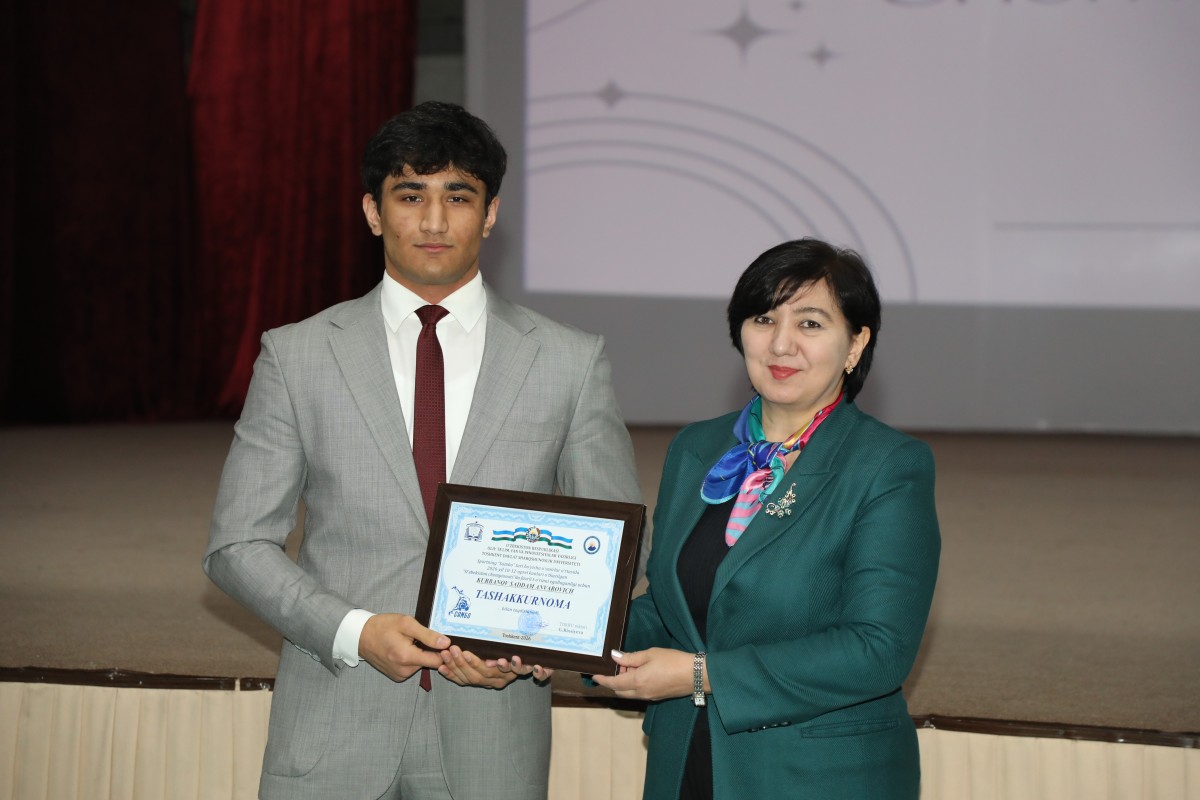 During the forum, certificates were awarded to the following students who were granted the special scholarship named after Suyima G‘aniyeva: Toshtemirova Shohsanam Sherali qizi, Mirsaidova Ozoda Nazirjon qizi, Azimqulova Mohinur Ulug’bek qizi, and O‘rolova Marjona Murodilla qizi. In addition, Kurbanov Saddam Anvarovich, a first-year student of the Institute of Foreign Policy and International Economic Relations, who won 1st place in the Uzbekistan Junior Sambo Championship, was awarded a letter of appreciation by the Rector.