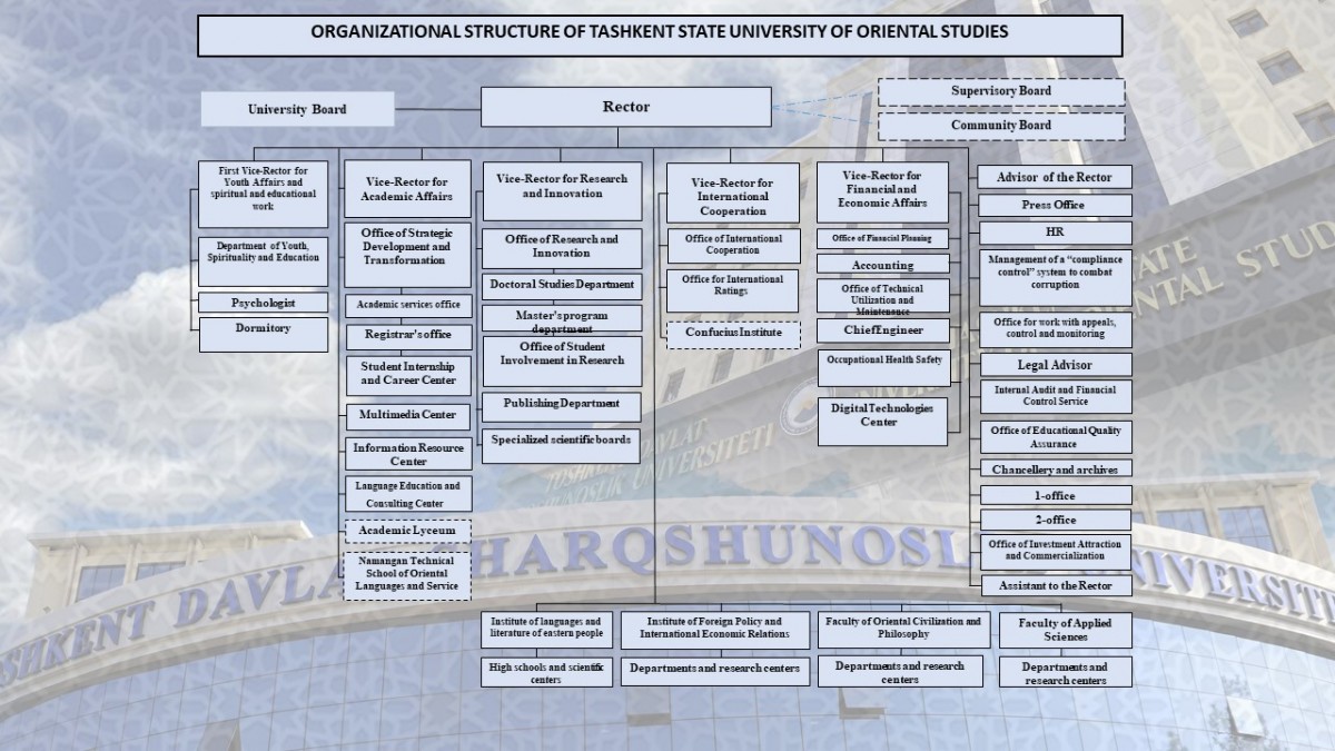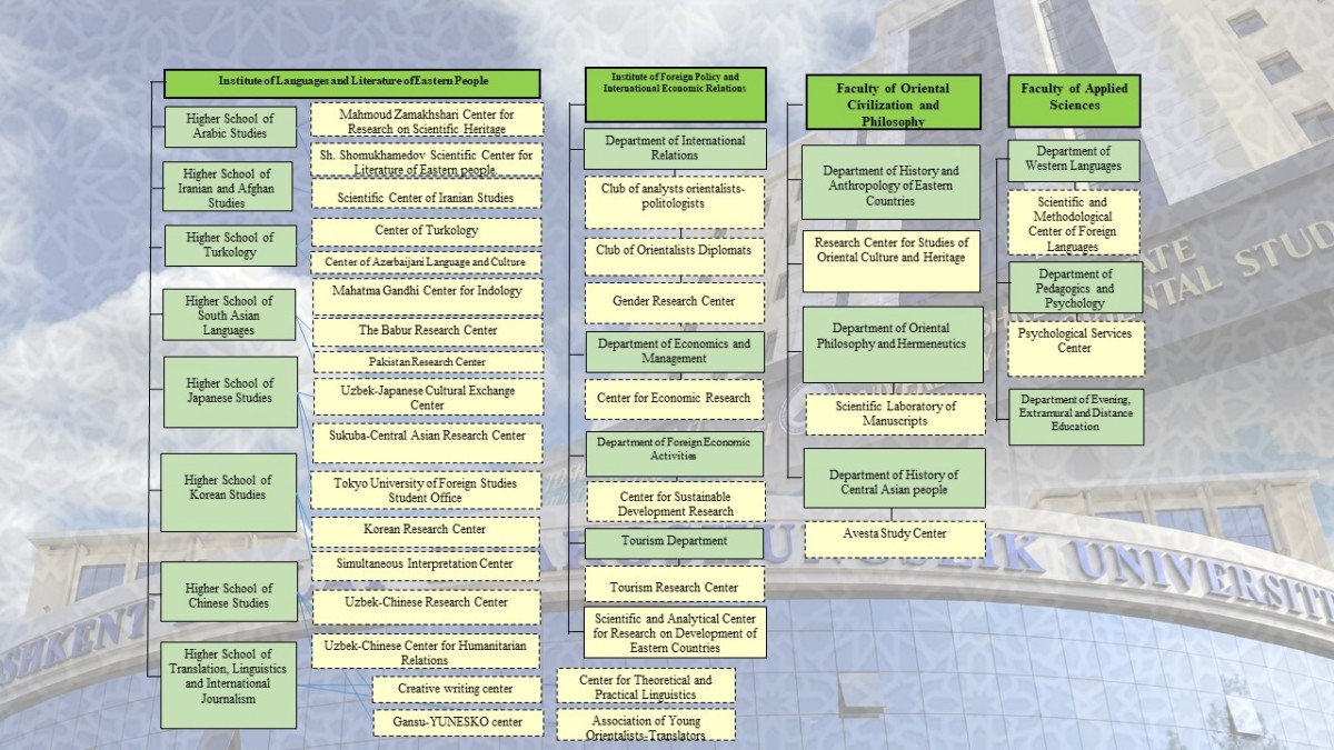 Organizational structure Rectorate Faculties and departments Centres, wards and councils Research centers Uzbek-Chinese institute named after Confucius Academic Lyceum Fight against corruption
