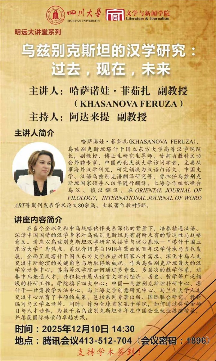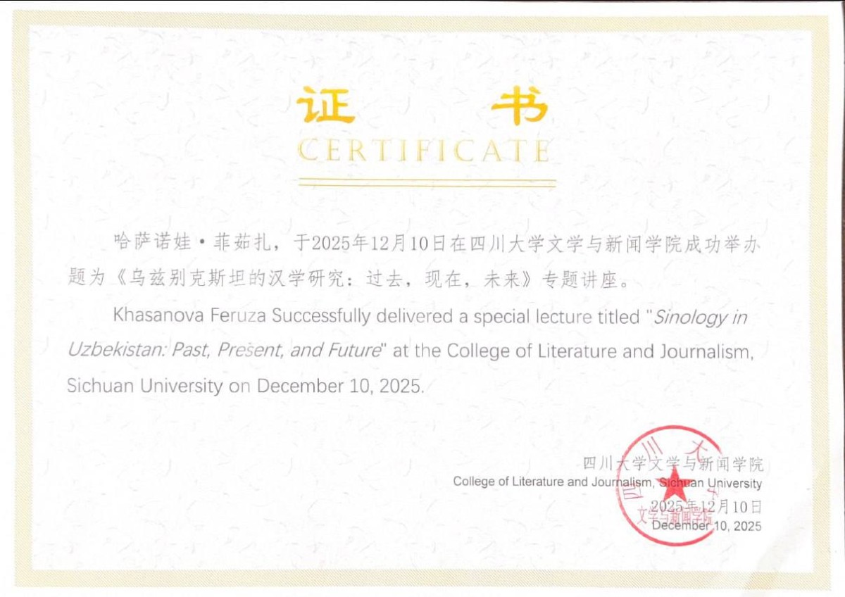 On December 10, 2025, Feruza Khasanova, PhD, Associate Professor and Head of the School of Sinology at TSUOS, delivered an academic lecture titled “Sinology Research in Uzbekistan: Yesterday, Today, and Tomorrow” at the invitation of Sichuan University of the People’s Republic of China.