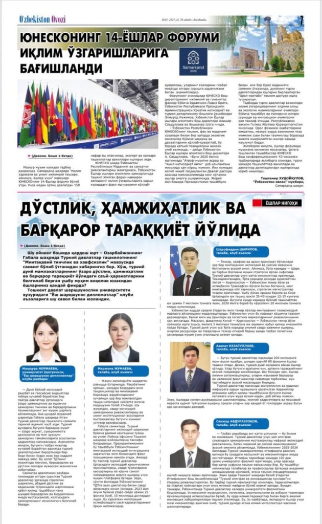 (Uzbek) TDSHU “Yosh sharqshunos diplomatlar” klubi a’zolari “O‘zbekiston ovozi” gazetasining 43-sonida