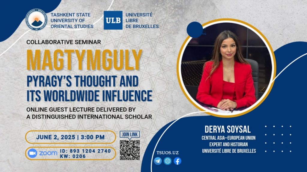 On June 2, 2025, an online lecture titled “Magtymguly Pyragy’s Thought and Its Worldwide Influence” was held at Tashkent State University of Oriental Studies, organized by the Department of History of Central Asian Peoples in collaboration with the Doctoral Studies Division. The event featured Derya Soysal, a researcher at the prestigious Université libre de Bruxelles (Belgium) and an expert on Central Asian studies.