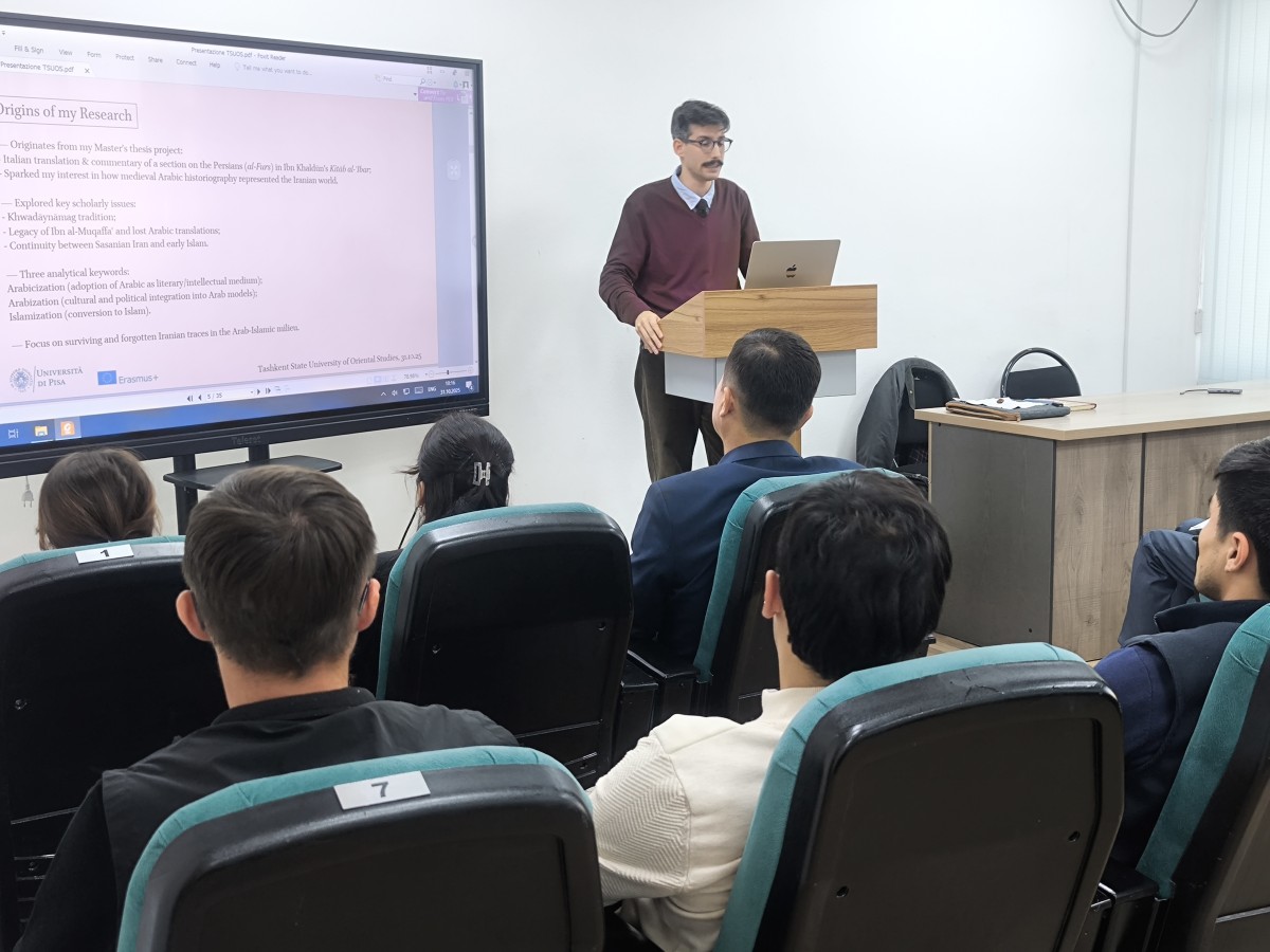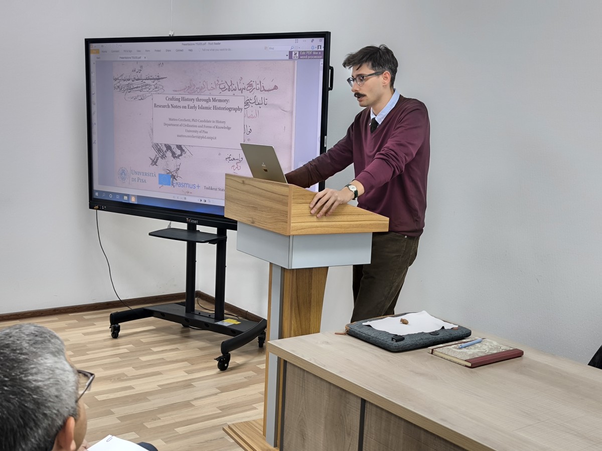 On October 31, 2025, at the Faculty of Eastern Civilization and Philosophy of Tashkent State University of Oriental Studies, a scientific seminar was organized by the Department of Central Asian History as part of the Erasmus+ ICM (International Credit Mobility) program. The event featured researcher and source studies scholar Matteo Cecchetti from the University of Pisa, Italy. The seminar was attended by the dean of the faculty, professors, doctoral candidates, researchers, master’s students, and undergraduates.