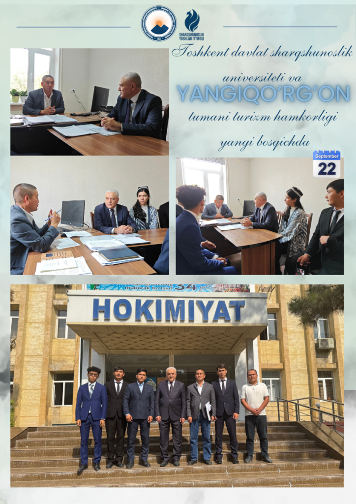 On September 22, 2025, a meeting was held between Chori Qodirovich Husanov, Head of the Department of Tourism at the Tashkent State University of Oriental Studies, and Esonbek Kholmirzayevich Mehmanov, Deputy Hokim of Yangikurgan District for Youth Policy, Social Development, and Spiritual-Educational Affairs. During the meeting, both parties reached an agreement on mutual cooperation aimed at enhancing the district’s tourism potential and developing modern tourism-related skills among local students and youth.