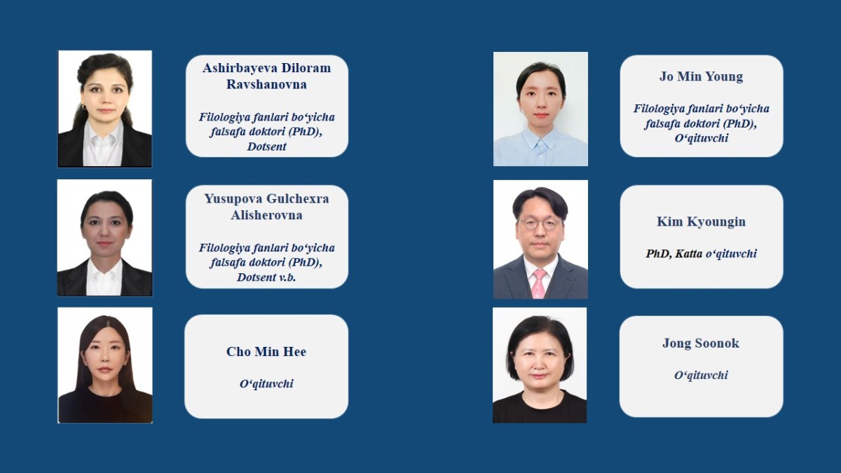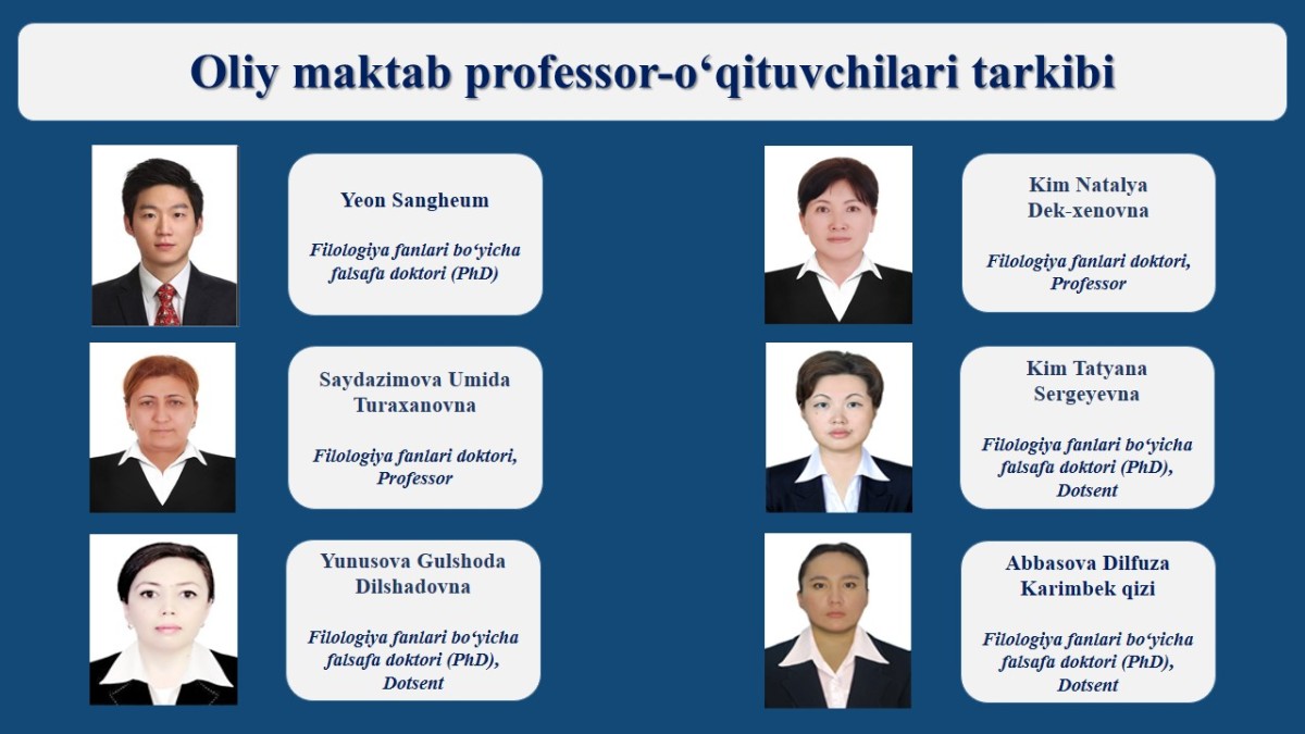 В 2025-2026 учебных годах в Высшей школе корееведения работают 18 преподавателей: 2 профессора, 4 доцента, 1 и.о. доцента, 1 старший преподаватель, 3 преподавателя и 5 преподавателей-стажёров. Из них 2 доктора филологических наук (Dsc), 8 докторов философии по филологии (PhD). В высшей школе работают 5 иностранных преподавателя, 3 из них – доктора философии по филологии (PhD) и 2 преподователя. Научный потенциал высшей школы составляет 59%. В высшей школе имеются специальности 60230100 – Филология и обучение языкам (по восточным языкам), 70230101 – Лингвистика (по восточным языкам). Студенты высшей школы корееведения являются лауреатами ряда международных и известных государственных стипендий, в том числе Государственной стипендии Навои, Ректорской стипендии имени Огахи. Студенты, обучающиеся по вышеуказанным специальностям, показали высокие результаты на Республиканских конкурсах по корейскому языку. Студенты Высшей школы корееведения являются активными участниками конкурсов эссе, проводимых в Центральной Азии и в дальнем зарубежье. Согласно соглашениям о сотрудничестве, заключенным между Высшей школой корееведения и престижными высшими учебными заведениями Республики Корея, студенты имеют возможность обучаться за рубежом на основе образовательного гранта.