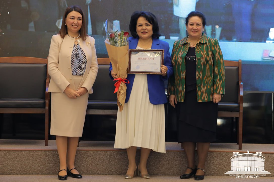 Bu yilgi tanlovda TDSHU professori Sanobar Shadmanova “Sharq mamlakatlarida gender munosabatlari (Sharqning eng mashhur 100 ayoli) elektron platformasini yaratish” loyihasi bilan g‘olib bo‘ldi. Shu munosabati bilan, 2024-yil 4-aprel kuni Oliy ta’lim, fan va innovatsiyalar vazirligida “Olima ayollar” ilmiy loyihalar tanlovi taqdirlash marosimi bo‘lib o‘tdi. Unda TDSHU rektori G.Rixsiyeva, Ilmiy ishlar va innovatsiyalar boʻyicha prorektor D.Sayfullayev, “Sharq madaniyati va merosini tadqiq etish ilmiy-tadqiqot markazi” rahbari N.Karimov hamda S.Shadmanova ishtirok etdilar.