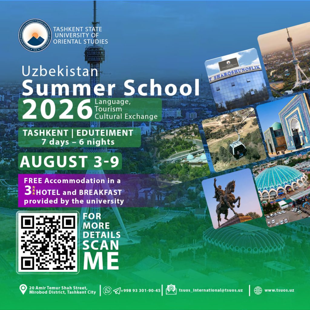 Toshkent davlat sharqshunoslik universiteti tomonidan tashkil etiladigan “Uzbekistan Summer School 2026 xalqaro yozgi maktab dasturiga qabul boshlandi. Ushbu yozgi maktab dasturi davomida ishtirokchilar tilshunoslik, turizm va madaniy almashinuvga bag‘ishlangan boy tajriba orttiradi. Shuningdek mazkur dastur turli xorijiy mamlakatlardan tashrif buyuradigan ishtirokchilarga O‘zbekistonning boy tarixiy merosi, rang-barang madaniyati hamda zamonaviy taraqqiyoti bilan yaqindan tanishish imkoniyatini yaratadi. Dastur qiziqarli akademik ma’ruzalar, interaktiv til kurslari, turli xil madaniy seminarlar va ekskursiyalarni o‘z ichiga oladi. Bu esa ishtirokchilarga O‘zbekiston haqida nafaqat nazariy bilim, balki amaliy tajriba ham beradi.