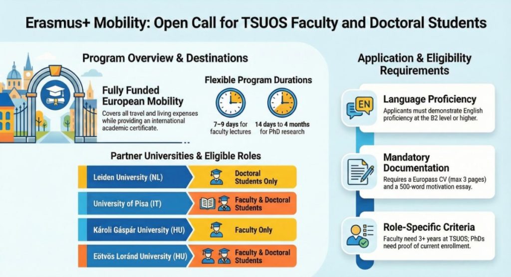 Toshkent davlat sharqshunoslik universiteti Erasmus+ Xalqaro Kredit Mobilligi (ICM) dasturi doirasida professor-o‘qituvchilar va doktorantlar uchun xorijiy oliy ta’lim muassasalarida o‘qish va malaka oshirish imkoniyatlarini e’lon qiladi.