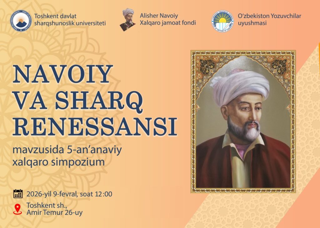 Buyuk shoir va mutafakkir, davlat va jamoat arbobi Alisher Navoiy tavalludining 585 yilligi munosabati bilan Toshkent davlat sharqshunoslik universitetida Alisher Navoiy nomidagi Xalqaro jamoat fondi hamda O‘zbekiston Yozuvchilar uyushmasi hamkorligida “Navoiy va Sharq renessansi” mavzusida 5-an’anaviy xalqaro simpozium tashkil qilinmoqda. Xalqaro simpoziumga quyidagi yo‘nalishlar bo‘yicha maqolalar qabul qilish rejalashtirilgan: