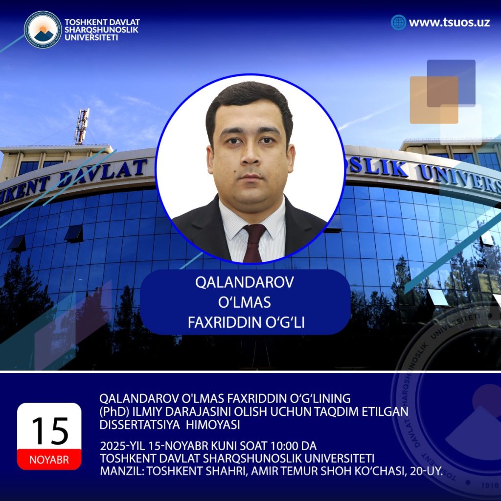 Защита диссертационной работы Каландарова Улмаса Фахриддиновича на тему «Афганский фактор во внешней политике Ирана (конец XX – начало XXI века)», подготовленной для получения ученой степени доктора философии (PhD) по истории по специальности 07.00.05 — Международные отношения и история внешней политики, состоится 15 ноября в 10:00.