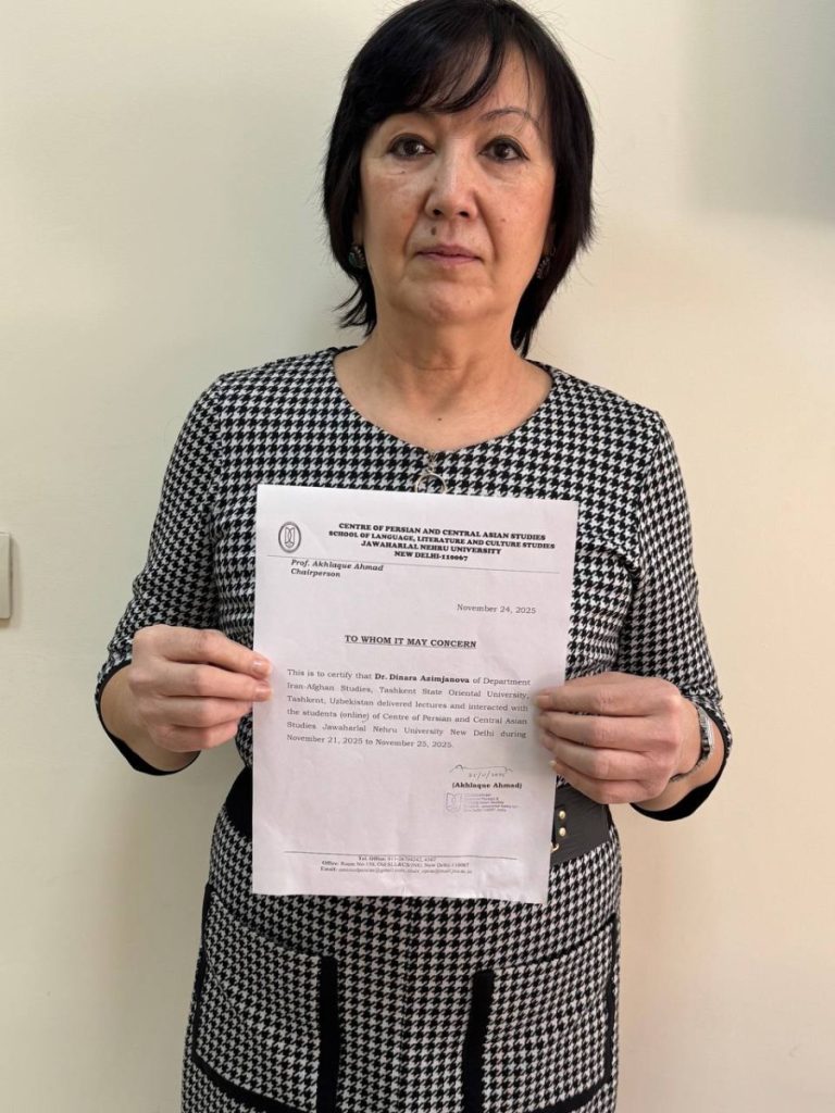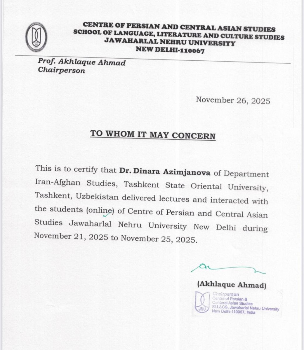 Доцент Высшей школы иранистики и афганистики ТГУВ Д. А. Азимджанова в период с 20 по 26 ноября 2025 года прочитала онлайн-лекцию на тему «Классификация аббревиатур в лингвистике» в Школе языков, литературы и культурологии и Центре персидских и центральноазиатских исследований Университета Джавахарлала Неру (Индия).