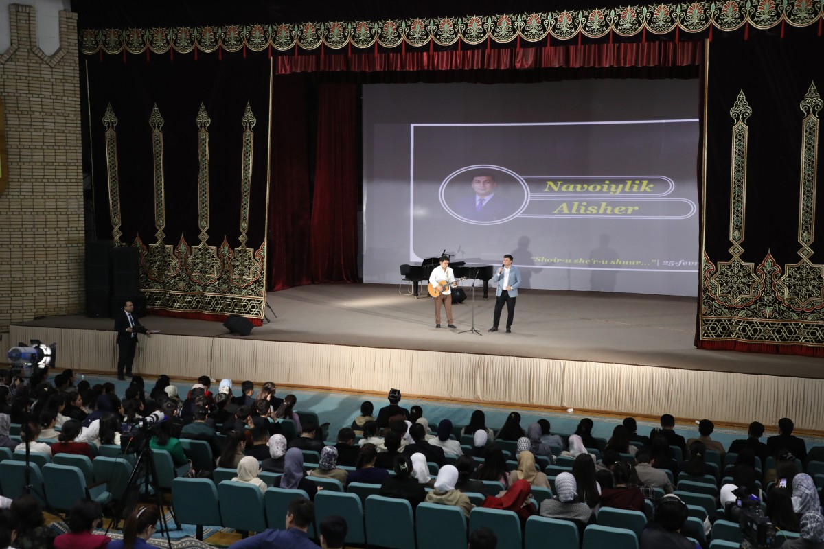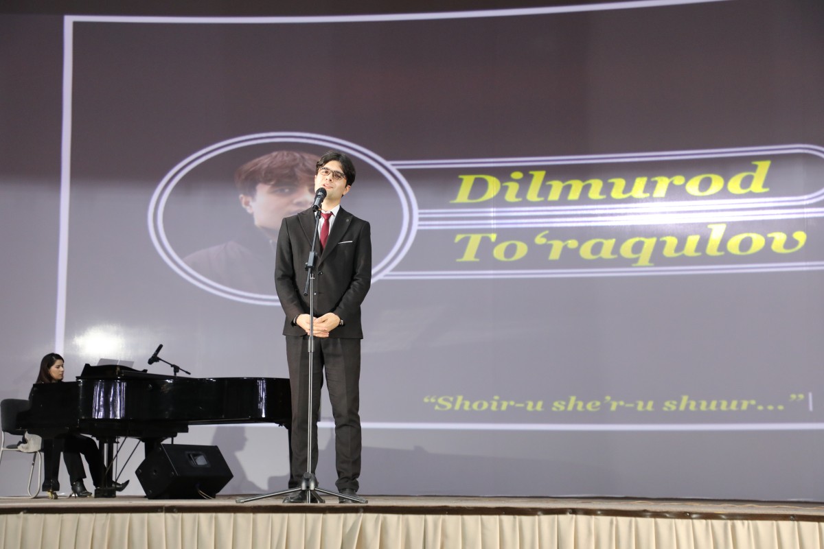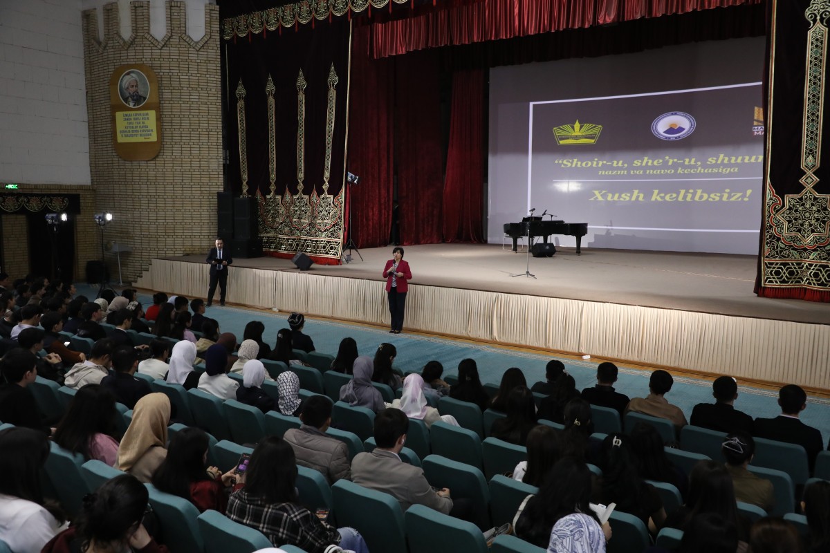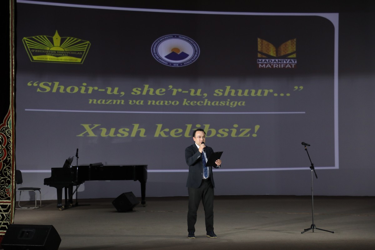 2026-yil 25-fevral kuni Toshkent davlat sharqshunoslik universitetida “Shoir-u she’r-u shuur” nomli nazm va navo kechasi tashkil etildi. Mazkur ma’naviy-ma’rifiy tadbir O‘zbekiston Yozuvchilar uyushmasi hamda Madaniyat va ma’rifat kanali hamkorligida o‘tkazildi.