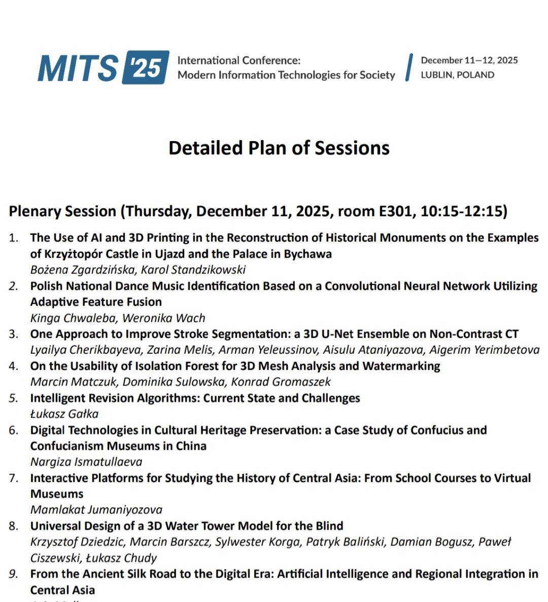 TDSHU Tarjimashunoslik, tilshunoslik va xalqaro jurnalistika oliy maktabi dotsenti, PhD Ismatullayeva Nargiza Rasuljanovna 2025-yil 11-12 kunlari Polsha davlati Lyublin texnologiyalar universitetida «Modern International Technologies for Society/ MITS’2025» mavzusida o’tkazilgan xalqaro konferensiyada «Digital Technologies in Cultural Heritage Preservation: A Case Study of Confucius and Confucianism Museums in China» mavzuli ma’ruzasi bilan ishtirok etdi.