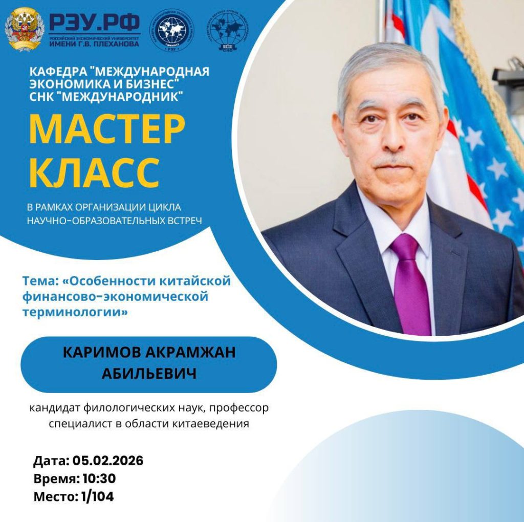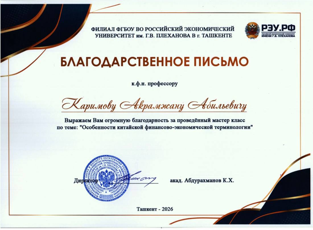 2026 -yil 5 -fevral kuni Toshkent davlat sharqshunoslik universiteti Xitoyshunoslik oliy maktabi professori, f.f.n. A.A. Karimov G.V. Plexanov nomidagi Rossiya Iqtisod universitetida “Xitoy tilidagi moliya-iqtisod terminologiyasining xususiyatlari” mavzusida ma’ruza o‘qidi.