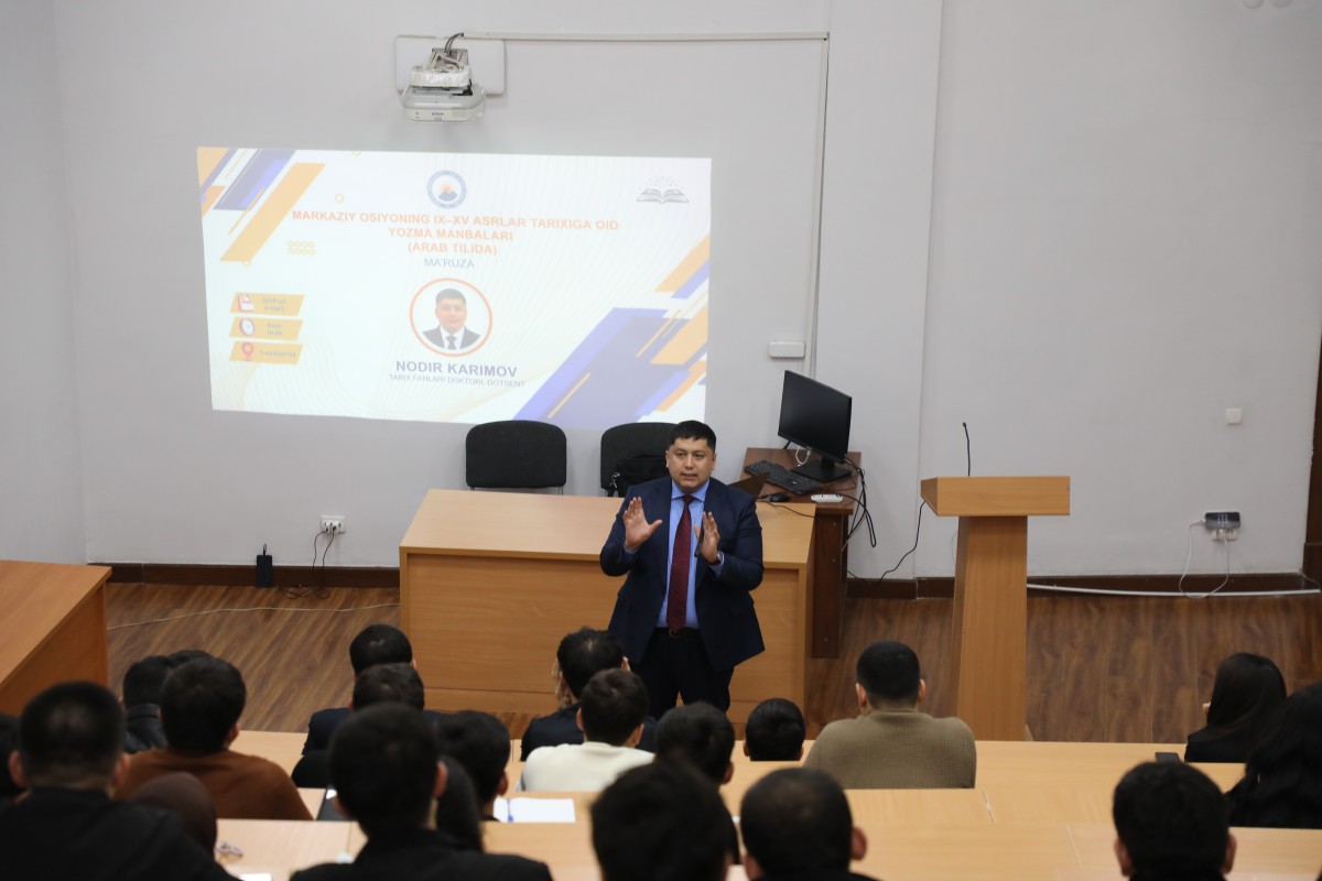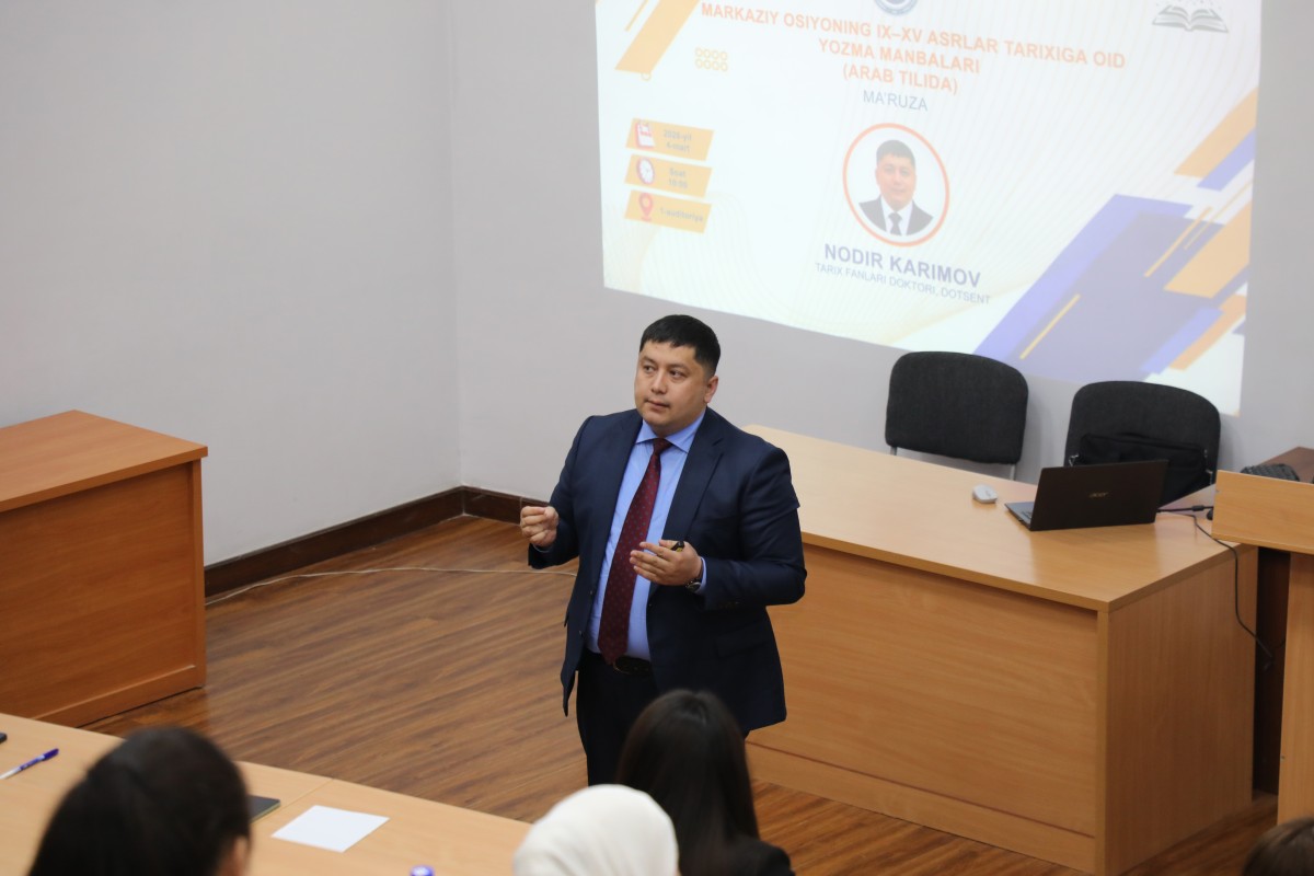 2026-yil 4-mart kuni Toshkent davlat sharqshunoslik universitetida DSc, dotsent Nodir Karimov tomonidan “Markaziy Osiyoning IX–XV asrlar tarixiga oid yozma manbalari” (arab tilida) mavzusida ochiq dars tashkil etildi.