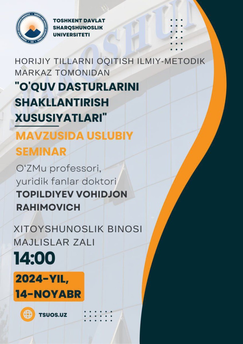 2024-yil 14-noyabr kuni TDSHU Horijiy tillarni o’qitish ilmiy-metodik markazi tomonidan O’zbekiston Milliy universiteti professori, yuridik fanlari doktori ishtirokida «O’quv dasturlarini shakllantirish xusisuyatlari» mavzusida uslubiy seminar bo’lib o’tdi.