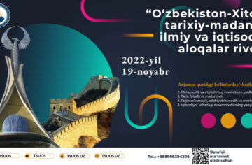 Toshkent davlat sharqshunoslik universitetida 2022-yil 19-noyabr kuni “O‘zbekiston-Xitoy: tarixiy-madaniy, ilmiy va iqtisodiy aloqalar rivoji” mavzusida Xalqaro ilmiy-amaliy konferensiya o‘tkaziladi. Konferensiya offlayn shkalda o‘tkaziladi. Anjuman maqsadi va vazifalari: Anjuman quyidagi bo‘limlarda o‘tkaziladi: 1. Tilshunoslik va o‘qitishning innovatsion usullari. 2. Tarix, falsafa va madaniy...