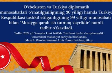 TDSHUda O‘zbekiston va Turkiya diplomatik munosabatlari o‘rnatilganligining 30 yilligi hamda Turkiya Respublikasi tashkil etilganligining 99 yilligi munosabati bilan “Moziyga qarab ish tutmoq xayrlidir” nomli tadbir o‘tkaziladi. TADBIR DASTURI O’ZBEKCHA Tadbir; 2022-yil 3-noyabr kuni 14:00da Toshkent davlat sharqshunoslik universiteti madaniyat saroyida boshlanadi. Manzil: Mirobod tumani Ami...